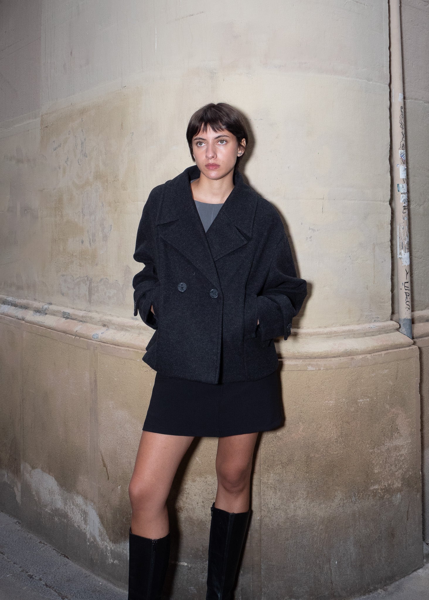 Abrigo corto oversized cruzado con doble abotonadura. Corte amplio y manga caída con detalles en el bajo. La prenda que complementará todos tus looks esta temporada.