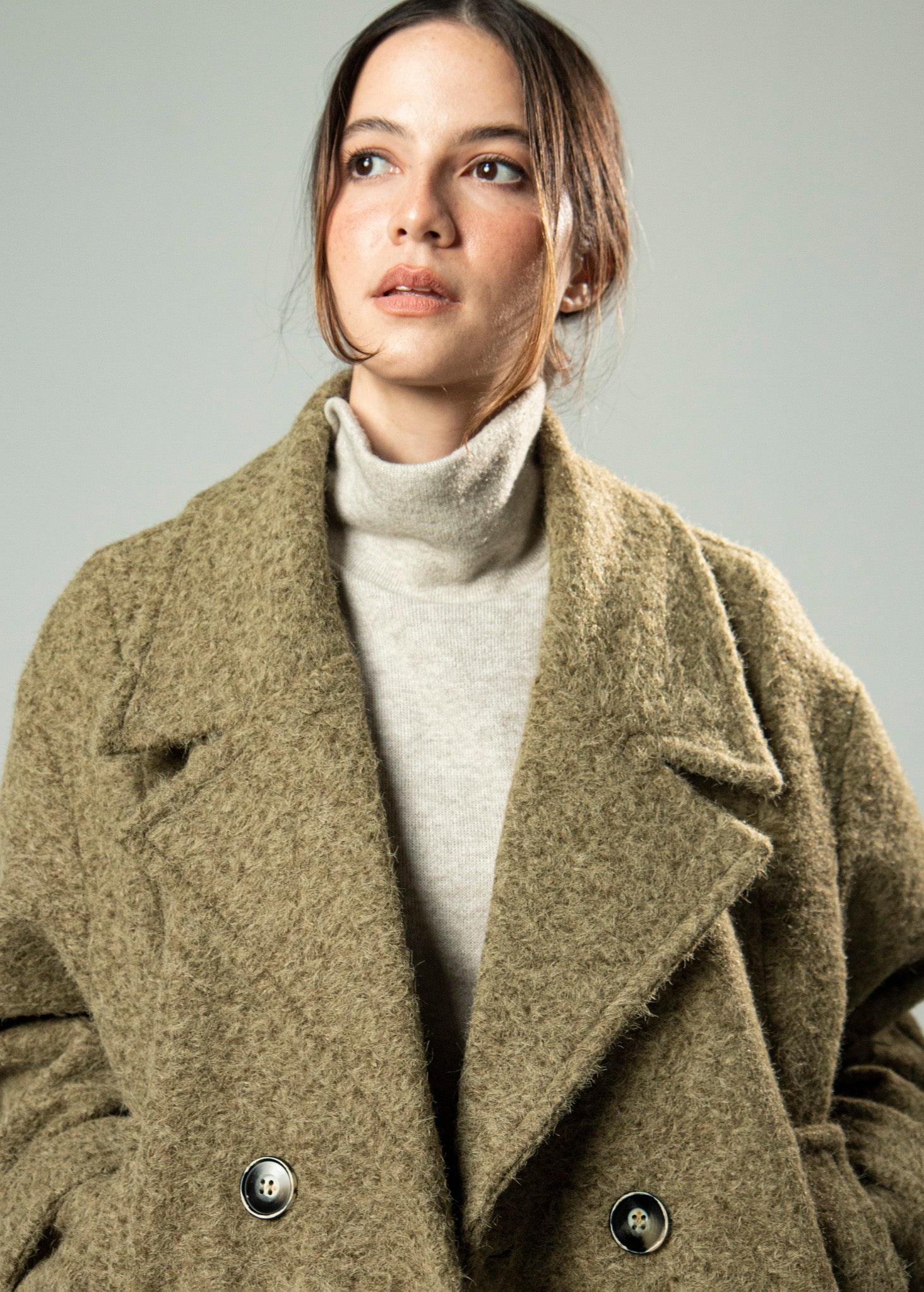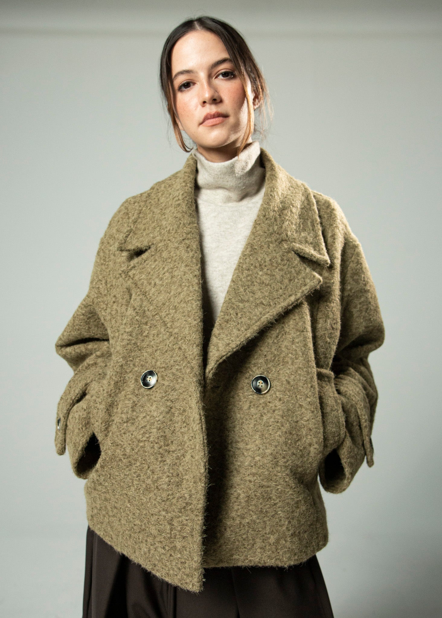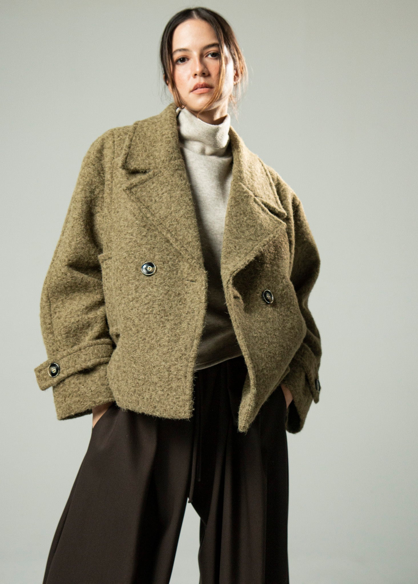 Abrigo corto oversized cruzado con doble abotonadura. Corte amplio y manga caída con detalles en el bajo. La prenda que complementará todos tus looks esta temporada.