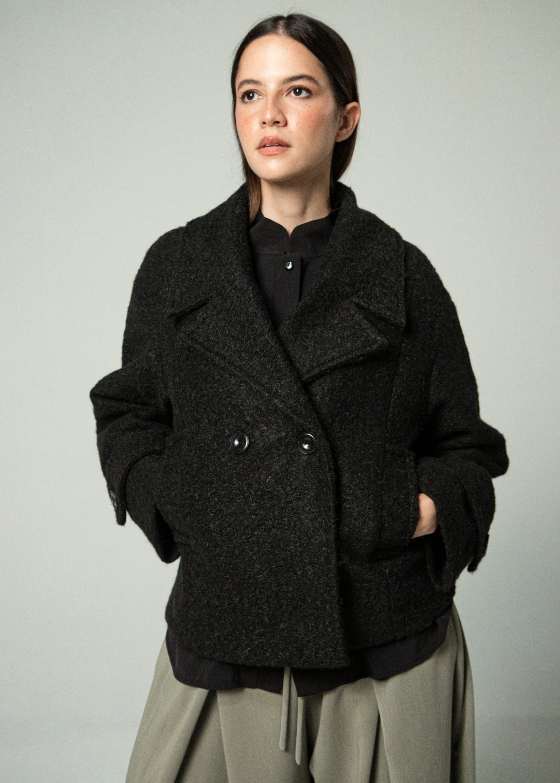 Abrigo corto oversized cruzado con doble abotonadura. Corte amplio y manga caída con detalles en el bajo. La prenda que complementará todos tus looks esta temporada.