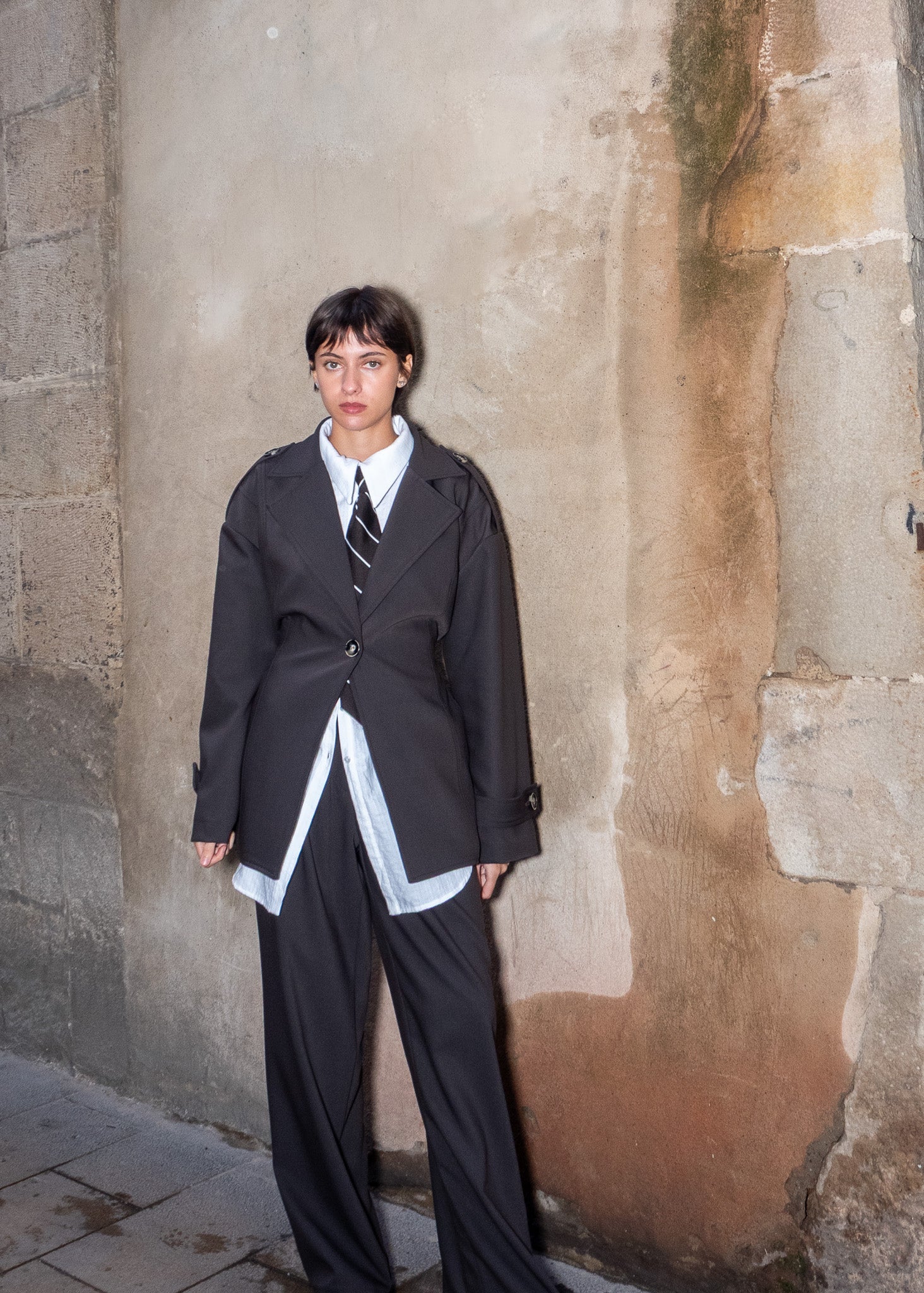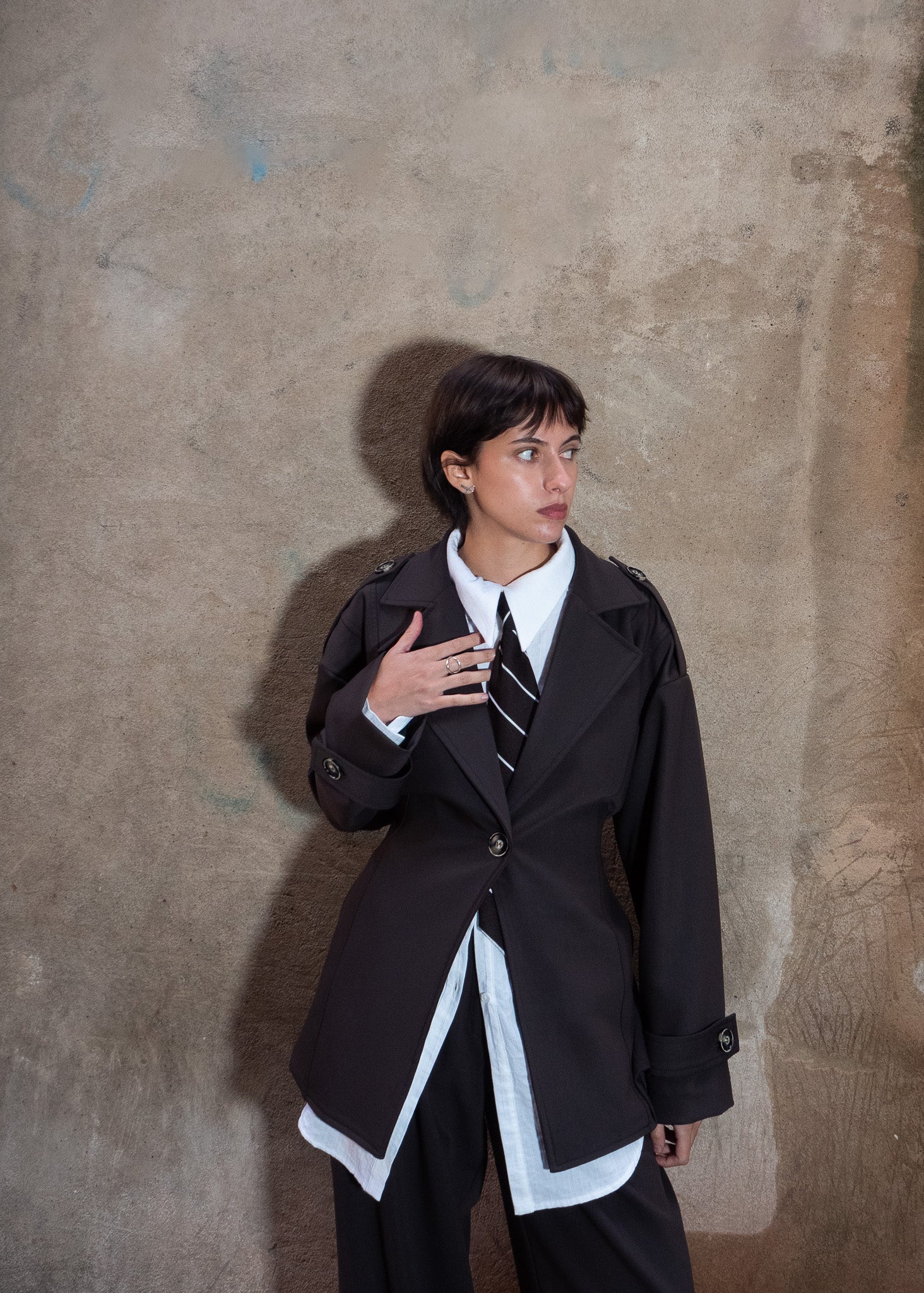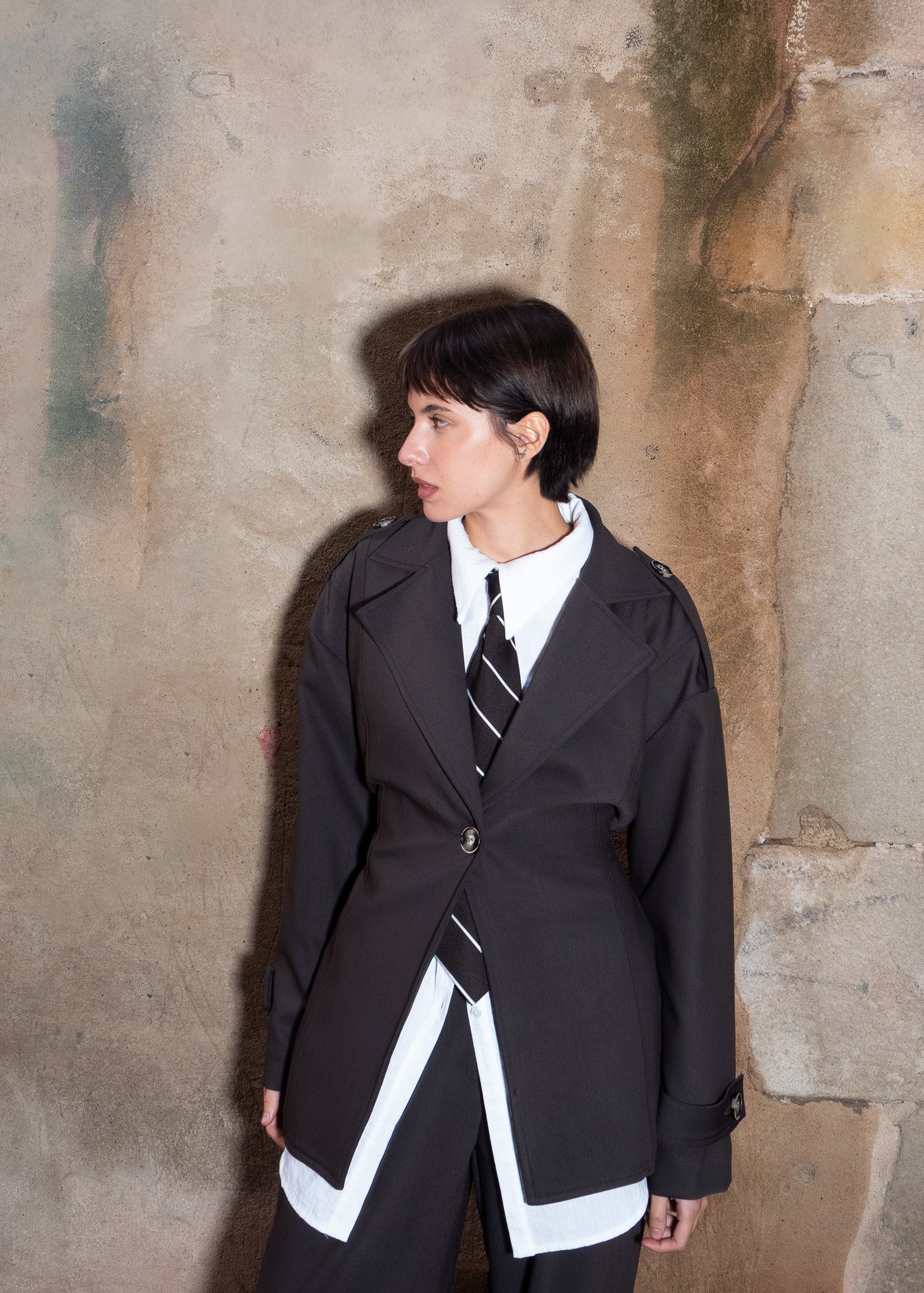 Americana oversized con manga caida, trabillas en manga y hombros y cierre mediante botón. Tira ajustable en la espalda con cierre metálico.