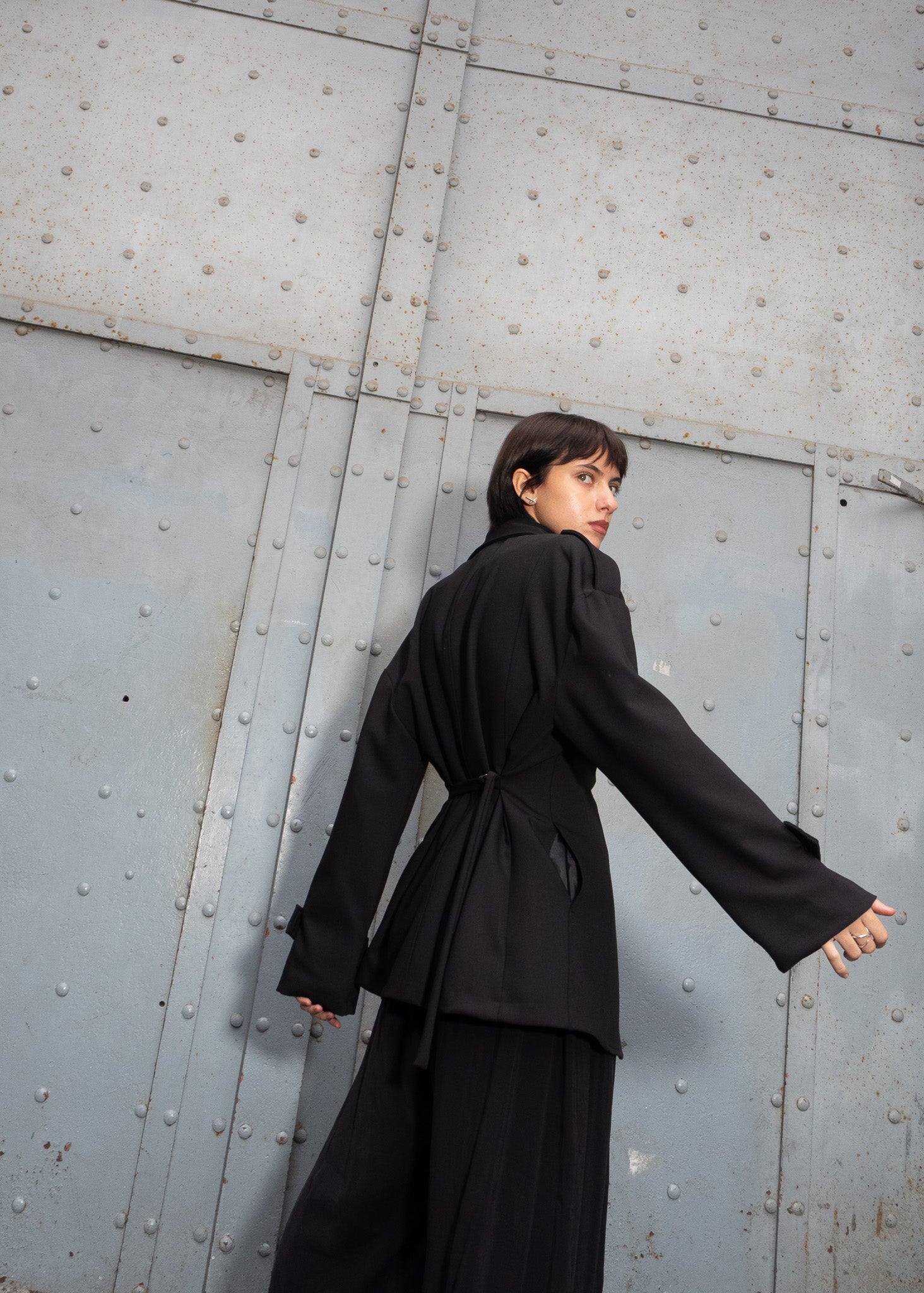 Americana oversized con manga caida, trabillas en manga y hombros y cierre mediante botón. Tira ajustable en la espalda con cierre metálico.