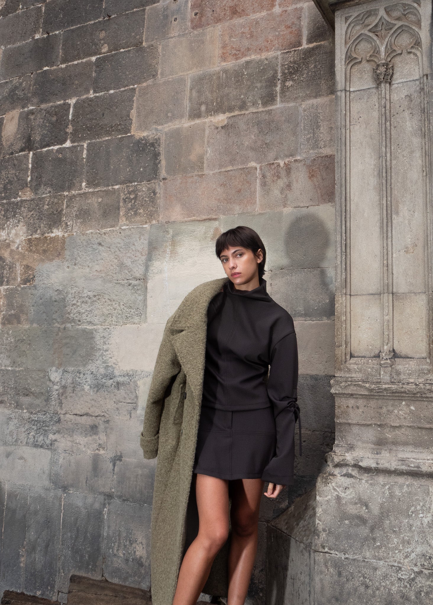 Minifalda con cinturilla y botón, con detalles y costuras horizontales y cargas de hilo al tono.