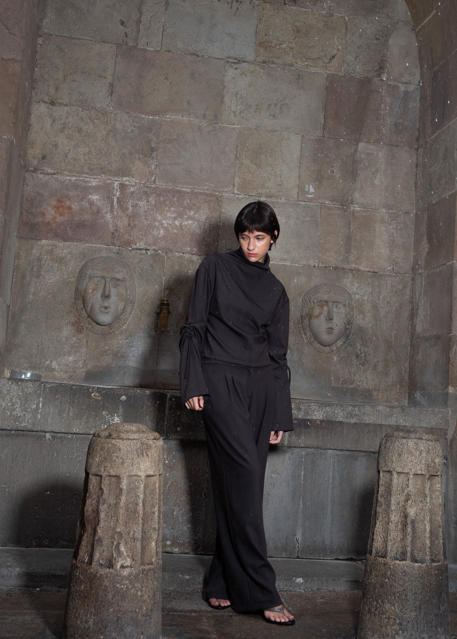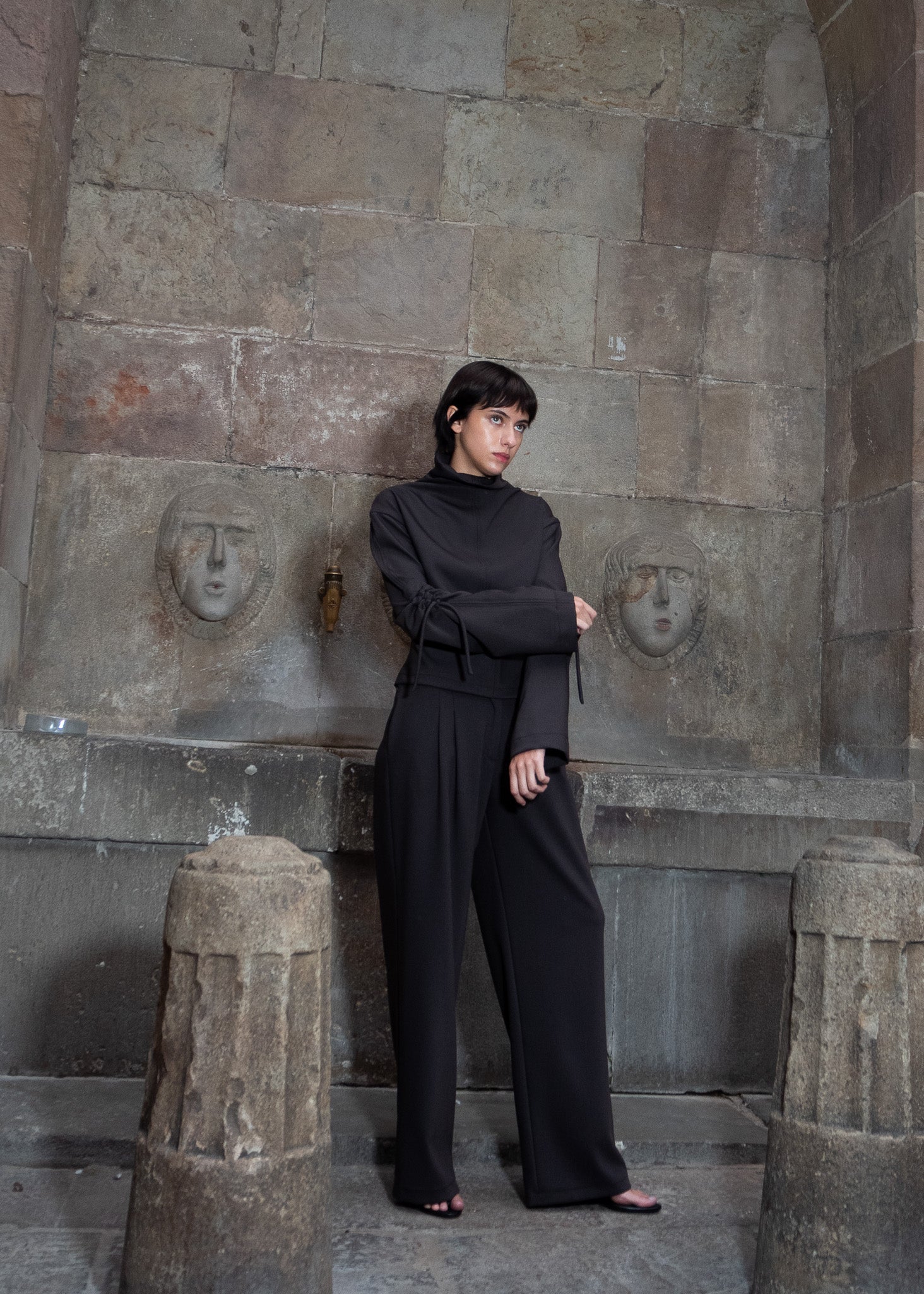Pantalón de pinzas de tiro bajo con doble pinza y goma en la espalda.