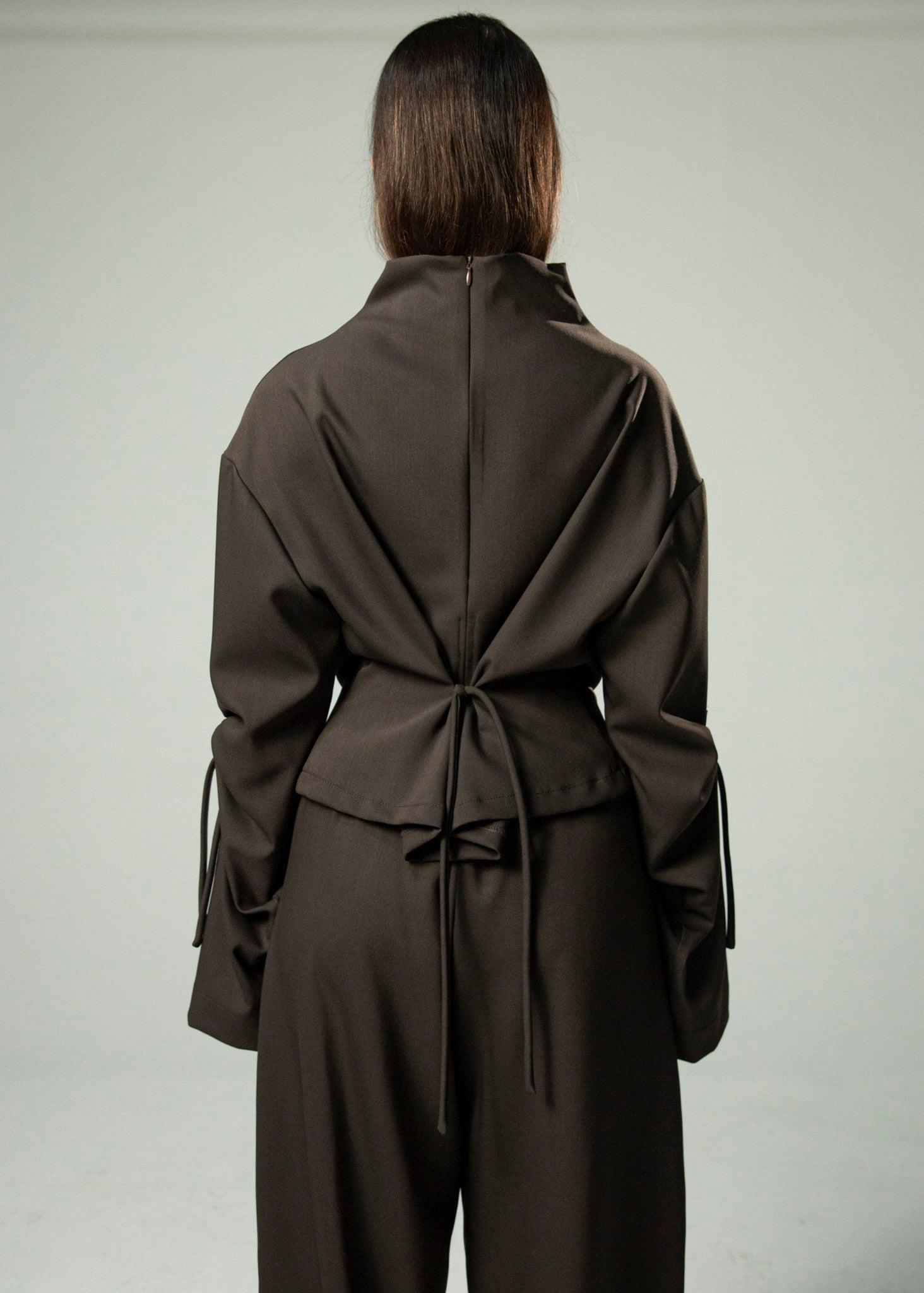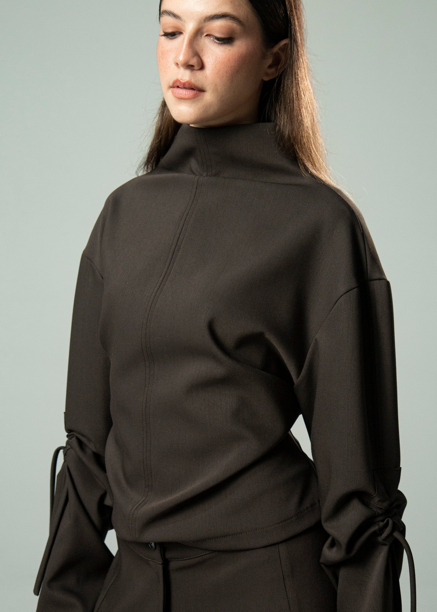 Top de cuello chimenea y manga evasé con detalle de frunce con lazada. Tiras en la espalda para ajuste en cintura.