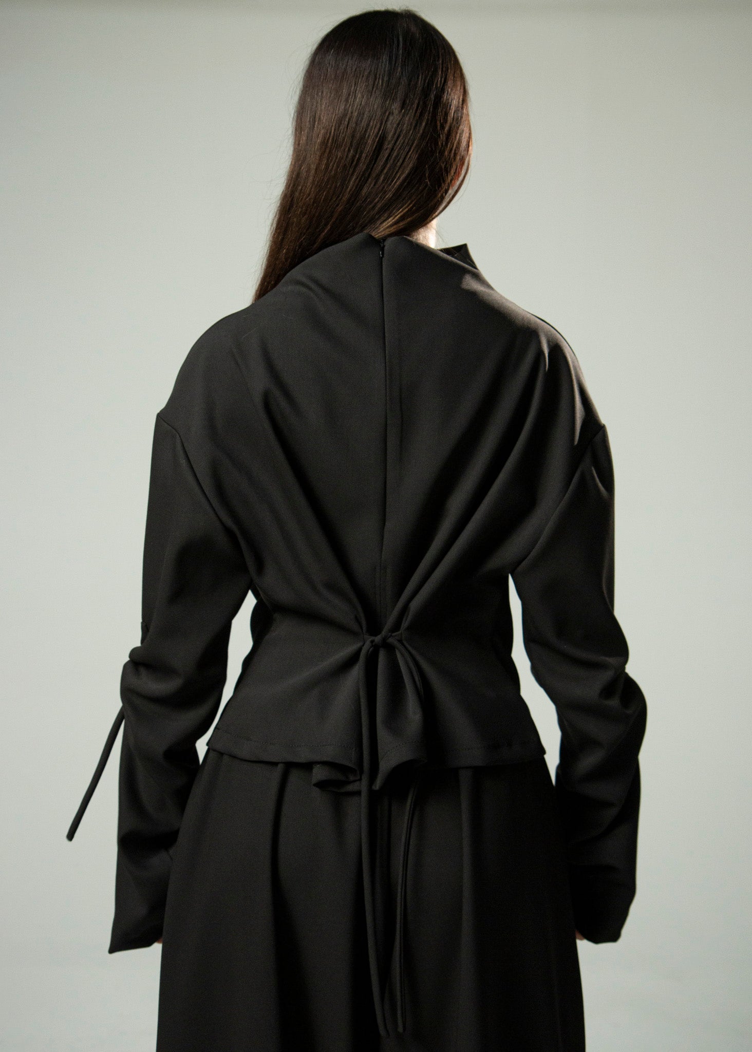 Top de cuello chimenea y manga evasé con detalle de frunce con lazada. Tiras en la espalda para ajuste en cintura.