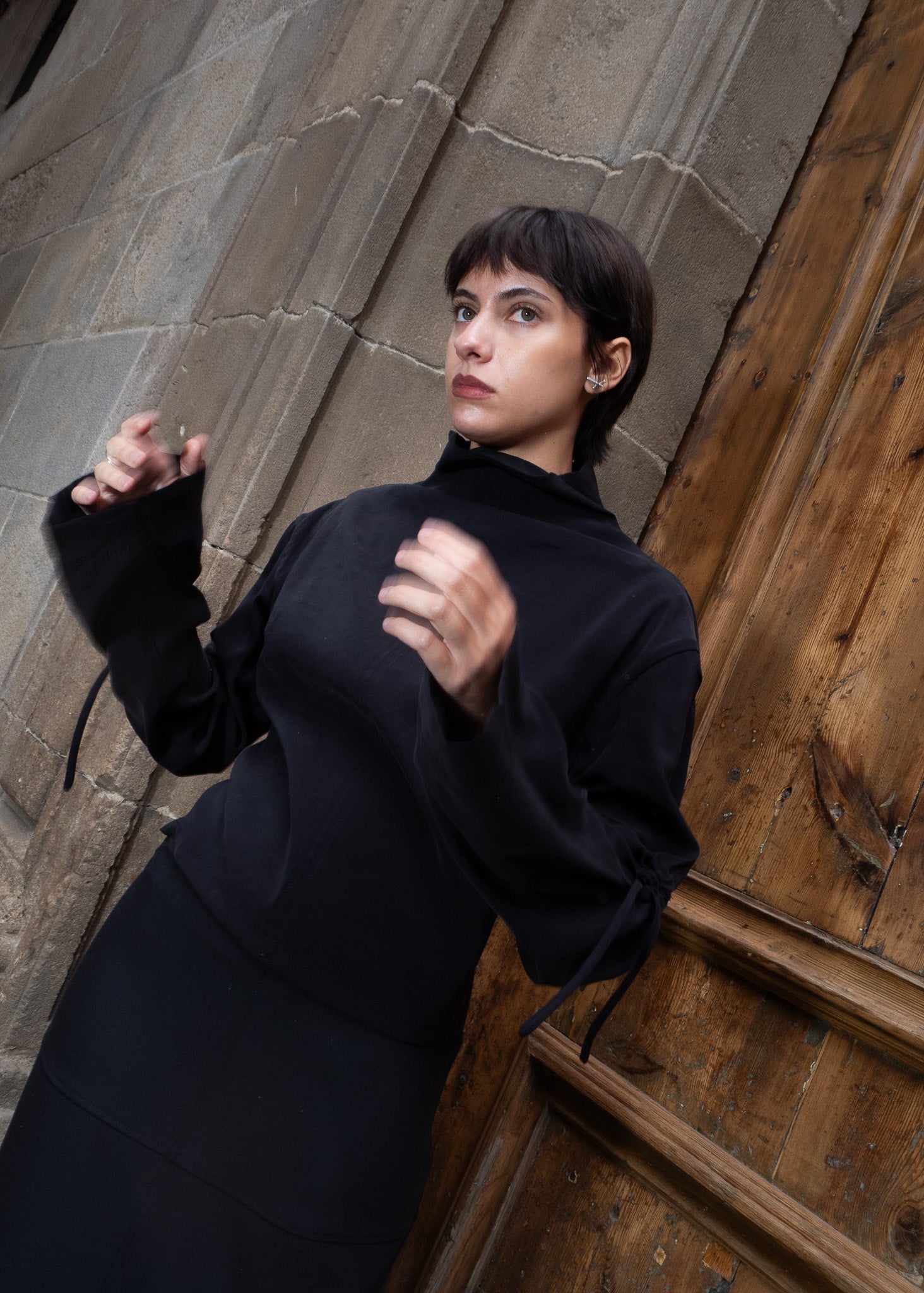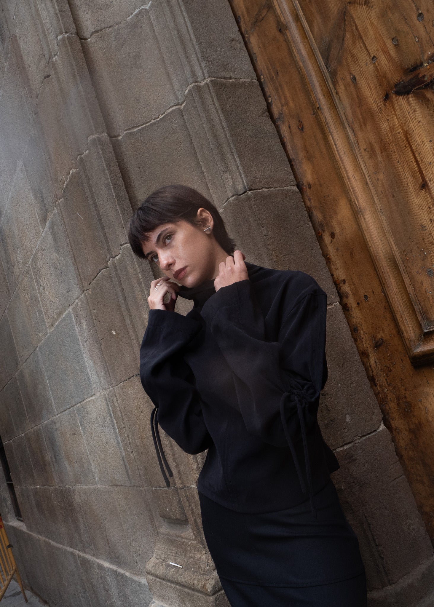 Top de cuello chimenea y manga evasé con detalle de frunce con lazada. Tiras en la espalda para ajuste en cintura.