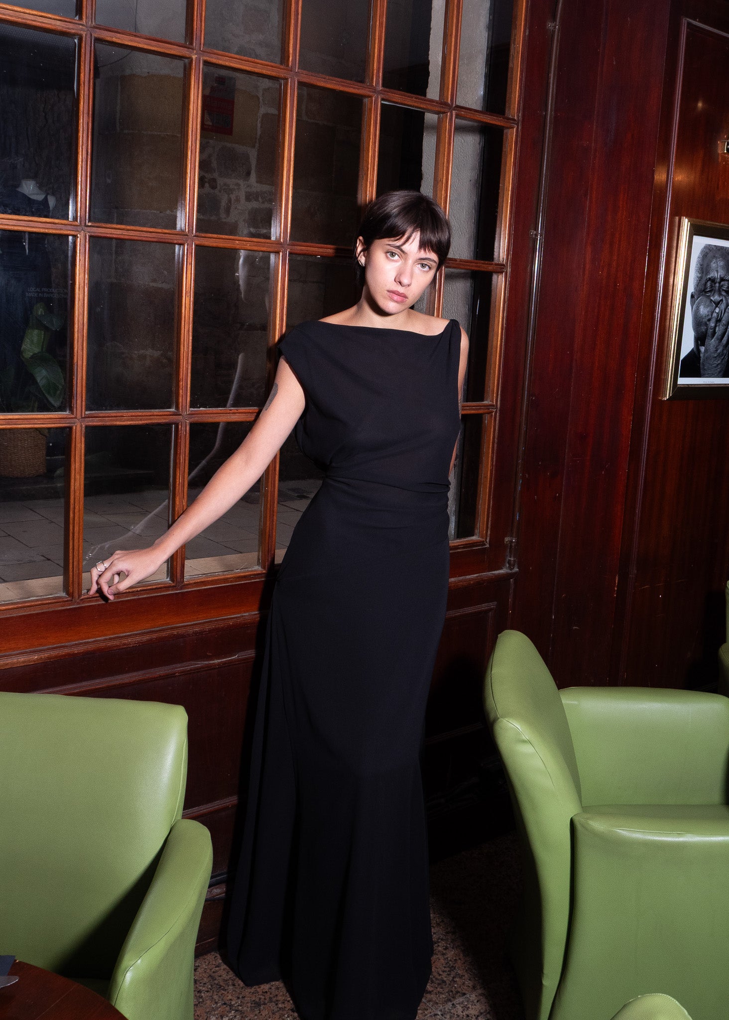 Vestido largo con escote asimétrico y corte diagonal en cadera. Espalda en 'V' descubierta con cierre mediante cremallera y tiras ajustables en cintura.
